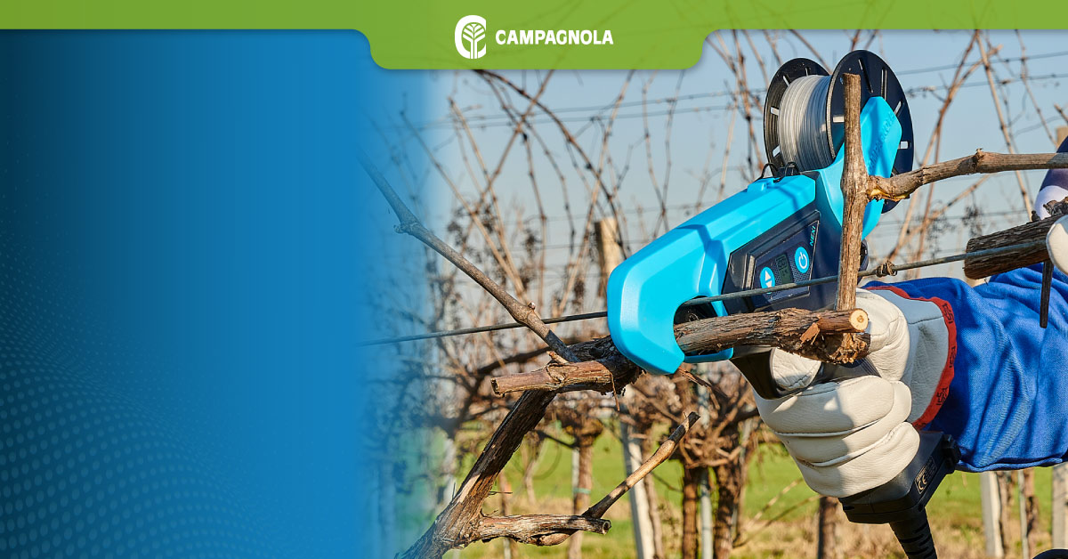 La batería se inserta en la base del cuerpo y su considerable ligereza permite mantener el peso total de la herramienta particularmente bajo. Por tanto, la atadora puede ser utilizada fácilmente por cualquier operario. Como alternativa a la versión con batería incorporada, también se puede utilizar con cable – patentado por Campagnola – y batería en el cinturón, insertada en una práctica funda. En este último caso, el peso de la atadora se reduce únicamente a 780 gramos.