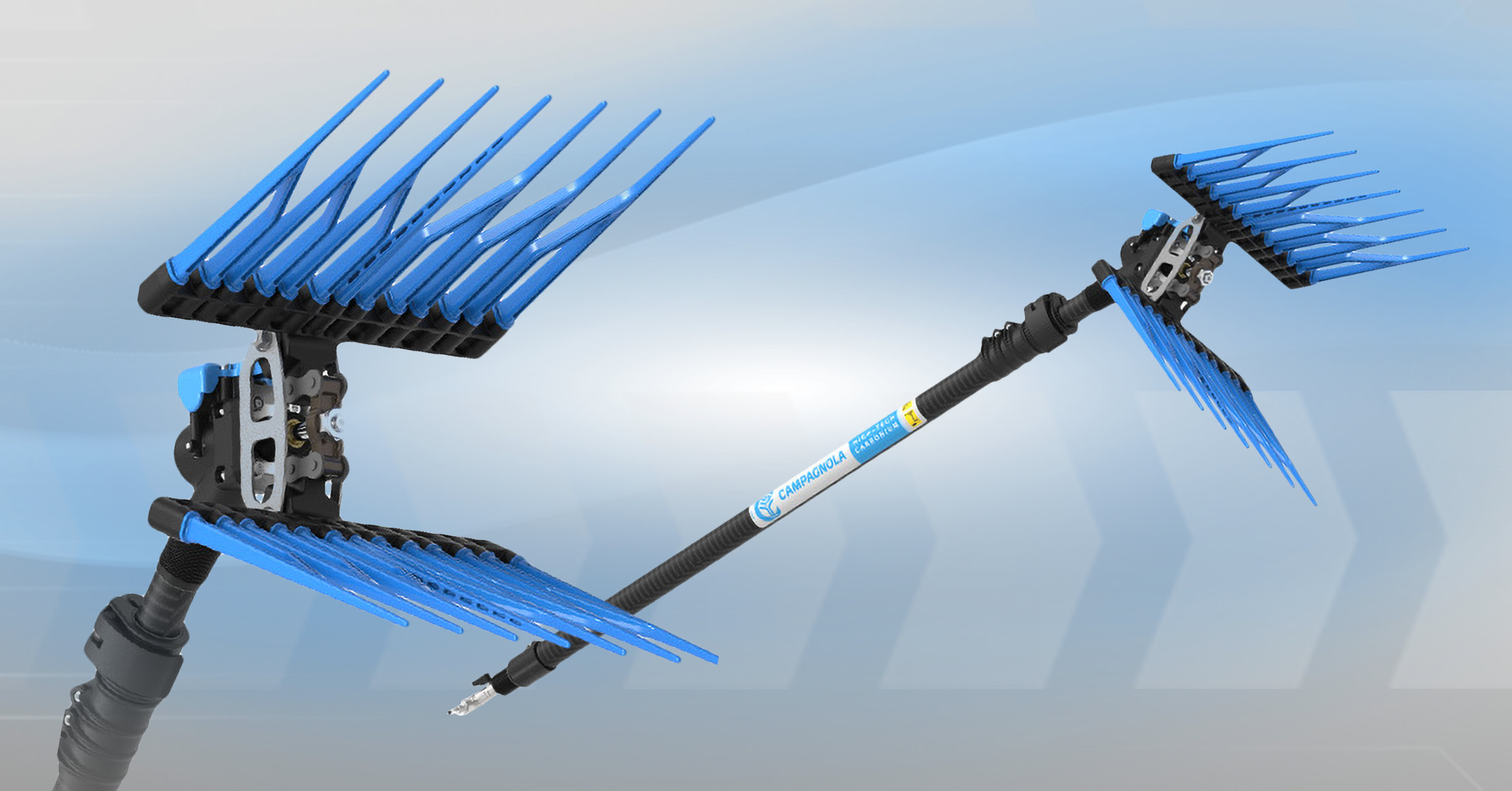 Para la temporada 2022 IRON ha sido equipado con nuevos rastrillos de tecnopolímero reforzado con carbono, que montan dientes largos con un patentado diseño de semidiapasón. Efectúan un movimiento opuesto para penetrar incluso el follaje más espeso sin riesgo de romperse o dañarse. IRON realiza una cosecha totalmente respetuosa con el bienestar de la planta. Cualquier descortezado, de hecho, podría ser una vía de acceso peligrosa para organismos patógenos, que podrían infectar los olivos, comprometer su salud y dañar las aceitunas.