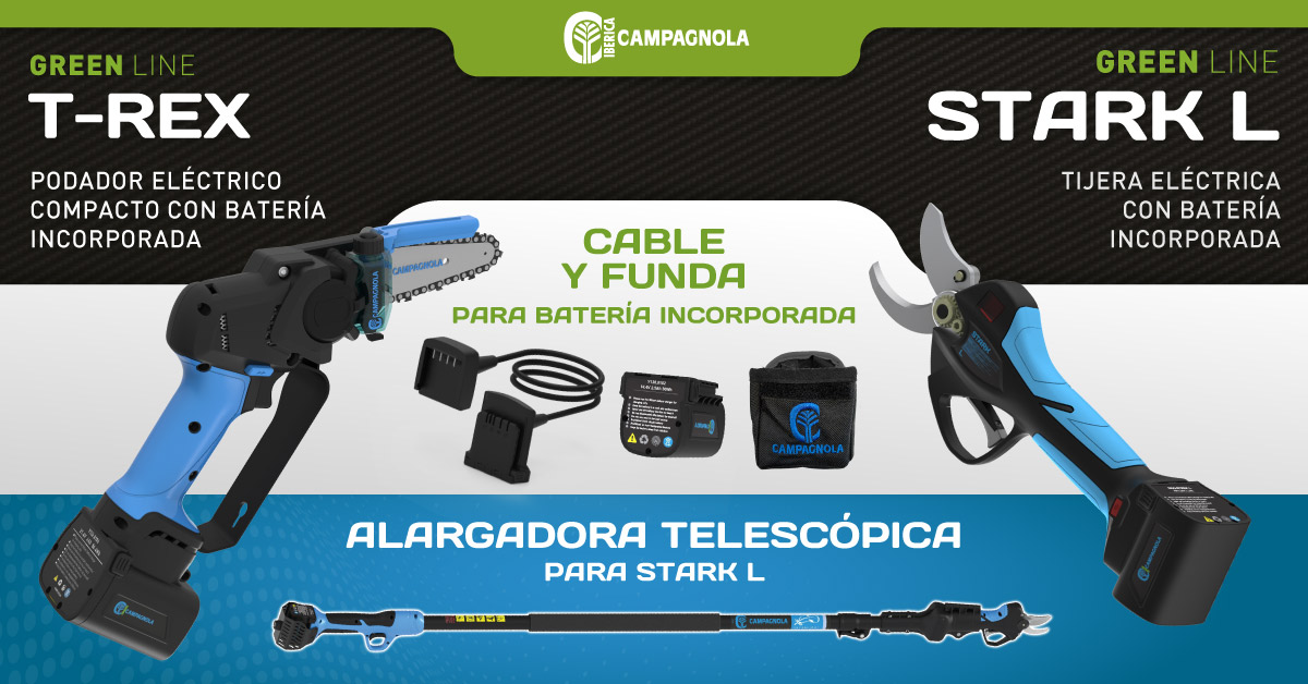 Finalmente, al estar Stark L y T-Rex equipados con la misma batería, ésta puede ser compartida entre los dos productos durante la poda en el frutal o en cualquier caso para actividades que requieran el uso de ambos tipos de herramientas.