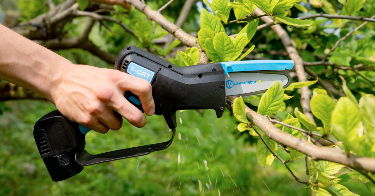 Para completar la línea de productos Campagnola dedicada a quienes realizan operaciones no intensivas en el verde, hay un nuevo podador de cadena eléctrico con batería enchufable: T-Cat, un concentrado de practicidad, diseñado específicamente para los usuarios que efectúan como aficionados intervenciones de poda de acabado y quieren, sin embargo, una herramienta de alta calidad.